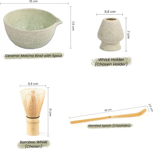 YABERCHA MATCHA TEA SET (10 PCS): Tazón de cerámica matcha con boquilla, batidor de bambú (Chasen), soporte para batidor (soporte Chasen), cuchara de bambú (chashaku), tamiz de té matcha, soporte para cucharas, toalla de té de algodón, cuchara medidora de madera, taza medidora, cepillo de limpieza HERRAMIENTA DE MEDICIÓN PARA PRINCIPIANTES: Vaso medidor (2oz/60ml) para ayudarte a obtener fácilmente la proporción precisa de polvo/agua, ya sea al preparar el sabor estándar de matcha o explorando el sabor único a tu gusto. (NOTA: La taza medidora no es apta para microondas) Calidad superior y diseño elegante: cada artículo del juego de té Matcha Yabercha está hecho de materiales de alta calidad. El cuenco de cerámica está fabricado con materiales sin plomo y sin mercurio, lo que garantiza un producto seguro y duradero. El batidor de bambú está tratado con un acabado de aceite vegetal para mejorar su longevidad y rendimiento, ofreciendo una opción sostenible y natural para la preparación de matcha. LA ESENCIA DE LA CEREMONIA TRADICIONAL DEL TÉ JAPONÉS: El juego de té Matcha de Yabercha no es solo un conjunto de herramientas; es una invitación a experimentar toda la belleza de la ceremonia del té japonés en casa. Cada pieza está diseñada para mejorar tu ritual matcha, aportando la elegancia, la serenidad y la tradición de la cultura japonesa a tu rutina diaria. IDEAL PARA USO DIARIO Y CEREMONIAS ESPECIALES: Este set es ideal tanto para el uso diario como para ceremonias especiales de matcha. Ya sea que estés preparando un matcha latte rápido por la mañana o organizando una reunión ceremonial de té, el conjunto de Yabercha garantiza que cada momento matcha sea agradable y significativo. Un regalo perfecto para los amantes del matcha: el juego de té Matcha Yabercha es un maravilloso regalo para cualquier persona que disfrute del matcha. Ya sea para cumpleaños, Día de la Madre, Día del Maestro, Día de San Valentín o Navidad, este juego es un regalo ideal que proporcionará una experiencia única y memorable para los entusiastas del matcha.