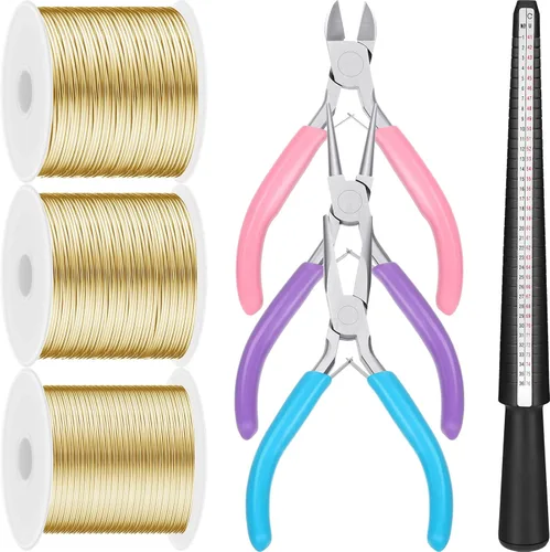 Lo que obtendrás: hay 1 rollo de alambre para manualidades de calibre 18 (aprox. 82.0 ft/27.3 yardas), 1 rollo de alambre para manualidades de calibre 20 (aproximadamente 82.0 ft/27.3 yardas) y 1 rollo de alambre para manualidades de calibre 22 (aprox. 54.7 yardas); además, obtendrás un medidor de anillos y 3 alicates de joyería; cantidad suficiente y diversas herramientas que pueden satisfacer tus diferentes requisitos de fabricación de joyas Embalaje de carrete cuidadoso: el alambre de joyería está empaquetado con un carrete resistente, que te ayuda a mantener el alambre de joyería en un rollo y no arruinará tu habitación, y también es conveniente para llevar y almacenar, ahorrándote mucho espacio Información del material: nuestros alambres de aluminio están hechos de material de aluminio sólido, resistente al óxido y no es fácil de romper, fiable y resistente, que se puede cortar fácilmente con alicates, simplificando el proceso de fabricación de tu joyería, te ofrece mucha comodidad Ampliamente aplicable: puedes aplicar estos alambres para crear varias manualidades de joyería, como anillos de salto, cables de oreja, tobilleras, pulseras, collares, colgantes envueltos en alambre, cadenas de cuentas, etc. También son adecuados para arreglos florales, enmarcar y manualidades de cabello Prácticos alicates y calibrador de anillos: las herramientas de alicates contienen alicates de nariz de cadena, alicates de punta redonda y cortadores de alambre de joyería, por lo que puedes utilizar alicates para doblar alambre de joyería, fijar y cortar alambre de manualidad; el mandril del tamaño del anillo está claramente marcado en el palo, fácil de obtener diferentes tamaños de anillo para tus manualidades de alambre de anillo de joyería