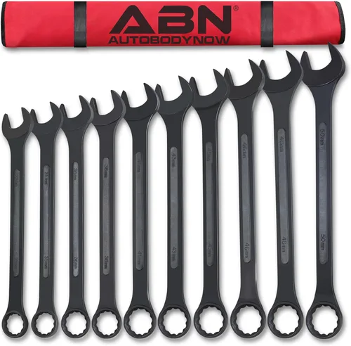 Juego de llaves extragrandes ABN: El juego de llaves extragrandes ABN incluye 10 llaves combinadas de gran tamaño en medidas métricas de 33 a 50mm [Diseñado para la durabilidad]: construido de acero forjado y tratado térmicamente con un acabado de óxido negro y un panel elevado para mayor resistencia [Herramientas de combinación]: el extremo de la llave de caja biselada de 12 puntos llega a espacios reducidos y el extremo abierto se agarra firmemente a los sujetadores para apalancamiento en cada situación Bolso de almacenamiento enrollable de lona para llaves: Organice su juego de llaves de equipo pesado con el rollo de almacenamiento de lona incluido con ranuras para cada llave grande; Cuelgue en tablero de clavijas desde ojales de metal Juego de 10 piezas: Incluye 10 tamaños métricos de 33, 35, 36, 38, 41, 43, 45, 46, 48 y 50 mm con marcas grabadas para una rápida identificación del tamaño