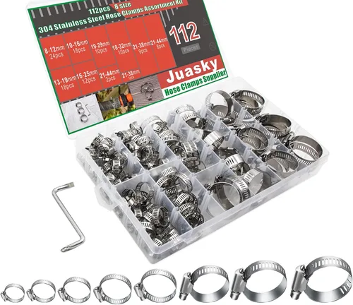 Material de acero inoxidable: todos los accesorios de la abrazadera de manguera están hechos de acero inoxidable 304, que es resistente y duradero, con buena resistencia al ácido y a la corrosión. Puedes utilizar la abrazadera de tubo de forma segura para fijar tuberías exteriores sin preocuparte por la oxidación y el agrietamiento Diseño ajustable: Todas las abrazaderas de manguera de acero inoxidable se pueden ajustar con tornillos de acuerdo con el diámetro de la tubería, de modo que la tubería se pueda fijar más firmemente. Ajustado herméticamente: la abrazadera del tubo es muy flexible y se puede atar firmemente a la tubería sin aflojarse, evitando así fugas de líquido 8 Especificaciones: Hay 112pcs o abrazaderas, incluyendo 8 especificaciones de tamaño. Su rango ajustable es de 24 piezas de 0.315-0.472 in, 18 piezas de 0.394-0.630 in, 18 piezas de 0.512-0.748 in, 12 piezas de 0.630-0.984 in, 10 piezas de 0.709-1.260 in, 10 piezas de 0.748-1.142 in, 10 piezas de 0.827-1.496 in y 10 piezas de 0.827-1.732 in. Especificaciones completas de tamaño para satisfacer tus diversas necesidades Amplia aplicación: el kit de abrazadera de manguera tiene una amplia gama de aplicaciones, y se puede utilizar para fijar mangueras, tuberías, cables, tuberías, tuberías de combustible, etc.
