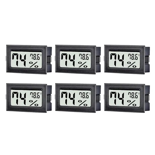 Nombre del producto: mini termómetro digital higrómetro. *Cantidad: 6 piezas; *Color: negro. *Tamaño: 1.89 x 1.12 x 0.60 pulgadas. * Tamaño del LCD: 1.406* 0.661 in/1.40* 0.66 pulgadas; * Tamaño del agujero: 1.81 x 1.06 pulgadas. *Rango de medición de temperatura: -58℉-158℉; * Rango de medición de humedad: 10%-99%RH; * Precisión de medición de temperatura: ± 2 ℉; * Precisión de medición de humedad: ± 5% RH.