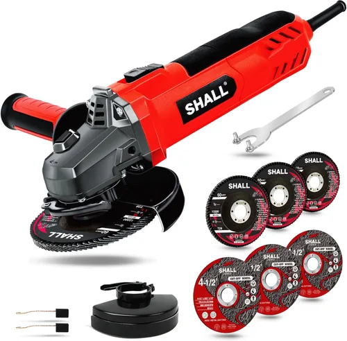 Nota: Hay 3 discos de corte envueltos en la película de plástico transparente, por favor retire la película para sacarlos. Súper potencia: equipado con un motor de 7.5 amperios junto con una salida de potencia máxima de 900 W, la salida de potencia única de esta amoladora angular de 4-1/2 puede producir una velocidad sin carga de 12000 RPM, lo que le da una capacidad de corte y molienda rápida Diseño de seguridad y conveniencia: viene con 2 tipos diferentes de protectores de rueda sin herramientas específicamente diseñados para proteger a los usuarios durante el corte y esmerilado; además, el interruptor deslizante tiene una función de bloqueo de encendido/apagado para facilitar la operación y el bloqueo del husillo elevado hace que sea fácil y seguro cambiar sus accesorios Compacto y ligero: El cuerpo estrecho y ligero de solo 3.7 libras le da a la amoladora herramienta eléctrica un agarre cómodo que hace que los usuarios experimenten menos fatiga incluso en un uso prolongado Diseño ergonómico: la amoladora angular tiene un mango lateral ergonómico de 2 posiciones hecho de goma antideslizante que te da mayor control y comodidad para diferentes ángulos y materiales; el interruptor deslizante diseñado en el medio es amigable tanto para las manos izquierda como para la derecha Tamaño universal: esta herramienta de amoladora de 4-1/2 pulgadas tiene un eje de 7/8 pulgadas con un rango de tamaño de husillo de 5/8 pulgadas -11 roscado Componentes incluidos: una amoladora angular, 2 protectores de rueda, 3 ruedas de corte, 3 discos de láminas (grano 60), 1 mango lateral y 2 escobillas de carbón; Con 2 escobillas de carbón adicionales, proporciona el doble de vida útil del motor que otros Amplia aplicación: la amoladora eléctrica de metal cuenta con un sistema de ventilación eficiente y eyección de polvo; ideal para cortar, afilar, eliminar el polvo y la preparación de la superficie