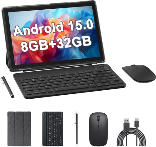Android 15 Tablets 10 pulgadas, 2 en 1 Tablet con funda para teclado, 8GB+32GB ROM/1TB, Quad Core, pantalla táctil HD, Dual Carema, juegos, Wi-Fi,