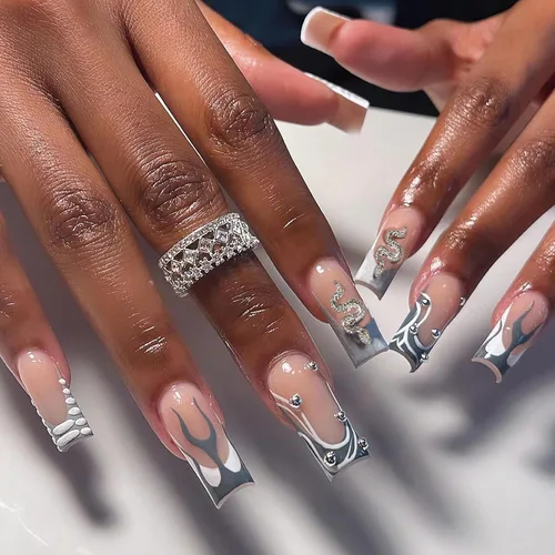BABALAL Uñas postizas cuadradas a presión, uñas postizas largas, punta francesa gris, pegamento en 3D, diseño metálico, uñas acrílicas góticas, 24