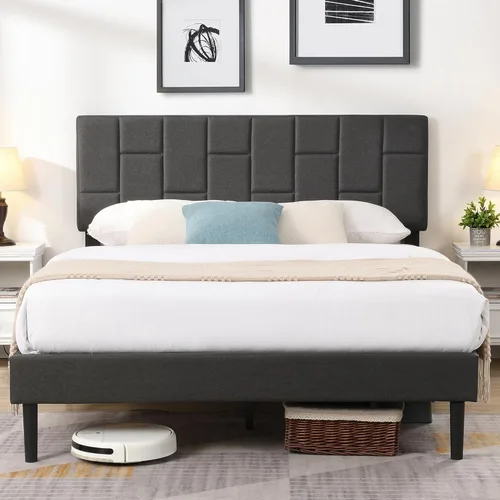 Base de cama tamaño Queen con cabecero, base de cama tapizada con plataforma de lino con soporte de listones de madera, sin ruido, no necesita