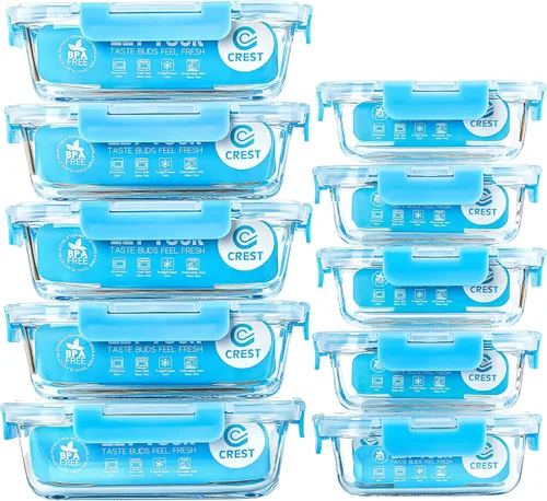 C CREST Contenedores de vidrio para preparación de comidas, [paquete de 10] recipientes de vidrio para almacenamiento de alimentos con tapas, cajas