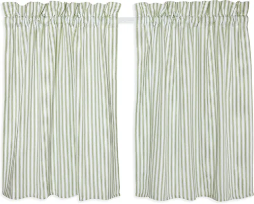 100 % Algodón Juego de dos cortinas clásicas de sarga de color verde estragón y rayas blancas Cada panel mide 28 pulgadas de ancho por 36 pulgadas de largo; cabecera de 2 pulgadas por encima del bolsillo de la barra y bolsillo para barra de 2 pulgadas, utiliza barra de 1 1/4 pulgadas o más pequeña Cenefa a juego y otros textiles para el hogar disponibles por separado La repetición mide diez rayas verdes y blancas por 6 pulgadas; resistente 100% algodón; lavar a máquina en frío, secar al aire; fabricado en la India Esta encantadora raya de color es ideal para todas las estaciones y estilos de decoración