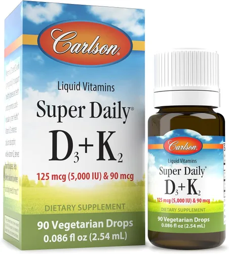 Carlson - Super Daily D3 + K2, 125 mcg (5000 UI) de vitamina D3, 90 mcg de vitamina K2 como MK-7, soporte óseo, 90 gotas líquidas (0.1 fl oz)