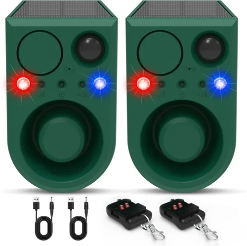 Resuelve el 99% de las preocupaciones de invasión animal: la alarma con sensor de movimiento ChunHee para exteriores se activa con luz estroboscópica con sensor de movimiento + sonido de ruido fuerte de 129 dB para ahuyentar a los intrusos y proteger tu hogar y propiedad. Más del 90% de los usuarios afirman que la invasión se reduce significativamente después del primer uso de la alarma del sensor de movimiento al aire libre Función de 4 modos Alarma al aire libre: El sensor de movimiento del perro ladrando ofrece cuatro modos de operación: 24 horas con flash y alarma, 24 horas con flash pero sin alarma, sonido con parpadeo a la luz y solo parpadeo en la luz (no sonido). Puedes elegir el modo de acuerdo a tus necesidades. Vea el video en la imagen principal para una mejor comprensión de esta alarma de sensor Alarma inteligente con detector de movimiento con control de sonido: la alarma de sensor mejorada al aire libre le permite grabar su propio sonido de alarma o elegir entre opciones predeterminadas como alarma de perro ladrando, gritos de águila, rugidos de león, sonidos de brazo. El sensor de movimiento de volumen ajustable de 3 sensores de ruido garantiza que no molestará a tus vecinos por la noche Carga solar y USB: la alarma de ladrido de perro con sensor de movimiento está equipada con un panel solar de alta capacidad y está hecha de carcasa ABS para protección 24/7. Carga USB como respaldo cuando largos días lluviosos, asegúrate de que funcione sin parar Fácil instalación y uso amplio: cuelga la alarma disuasoria de intrusos donde reciba suficiente luz solar. La alarma de ladrido para perros activada por movimiento es adecuada para granja, gallinero, granero, camping, hogar, jardín, patio y otros lugares donde se necesita alarma de movimiento con sirena Consejo para alarma de ladridos de perros: 1. Asegúrese de que la alarma solar se cargue bajo el sol durante al menos 1 días antes de la instalación. 2. Es posible que algunos animales no respondan de inmediato; puede tardar entre dos y cuatro semanas para ver los resultados.3. Si tienes alguna pregunta, puedes consultar el manual de usuario incluido