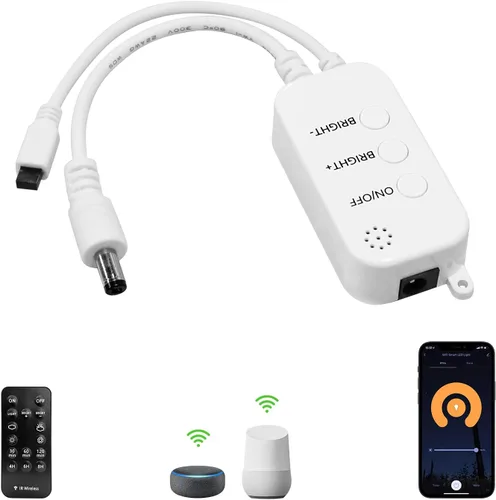【4 formas de control】Con controlador wifi LED inteligente, las luces se pueden controlar de cuatro maneras: caja de control, control remoto IR, control de aplicación de teléfono y control de voz. 3 opciones de control pueden satisfacer tus demandas de controlar las luces y traer varias funciones para que las experimentes. 【Ajusta el brillo】Para satisfacer tus necesidades de ajustar el brillo, nuestro kit de control remoto IR tiene los botones "BRILLANTE +" y "BRILLANTE" en la caja de control y el control remoto para ajustar el brillo deseado. Además, tirar de la barra de brillo en la aplicación del teléfono puede ajustar los niveles de ligereza. Función de temporizador: el control remoto actualizado de 15 teclas tiene la función de temporizador. Hay 6 botones de período de tiempo específicos para tu elección. Además, puedes usar la función "Temporizador" o programar tu horario privado en la aplicación del teléfono para encender/apagar tus luces automáticamente. Controlador LED WiFi: el controlador inteligente LED inalámbrico WiFi es compatible con Alexa y Google Assistant e IFTT, que logran un control de voz manos libres. En comparación con otros controladores ordinarios, puede controlar las luces desde cualquier lugar para superar las desventajas del control de larga distancia y el bloqueo de obstáculos. Instalación del controlador: solo tienes que conectar el controlador wifi entre la fuente de alimentación y las luces de disco. Si quieres controlar las luces con el control remoto, deja el controlador expuesto. Descargue la aplicación Tuya Smart en su teléfono móvil e instalación rápida con guía paso a paso. Nota: el controlador wifi solo admite red de 2.4 GHz, pero no se puede utilizar para red de 5.0 GHz.