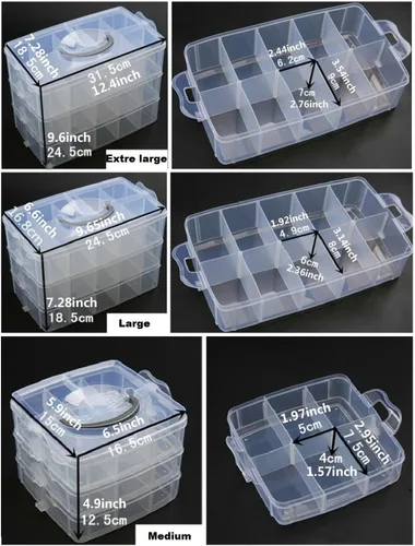 Nota: estos organizadores tienen 3 tamaños, 4 colores, tamaño y peso referencia a las fotos del producto. Los artículos son de forma irregular y se miden a mano, el tamaño del artículo real que recibas puede ser ligeramente diferente del tamaño anterior. Ten en cuenta que debido a los efectos de iluminación, el brillo del monitor, los ajustes de contraste, etc., podría haber algunas ligeras diferencias en el tono de color de las imágenes y el artículo real. Descripción: 1. Este impresionante organizador de cubos a presión está hecho de plástico transparente que facilita la localización de tus artículos. 2. Este cubo de almacenamiento tiene 3 niveles que cada uno se bloquea junto con un pestillo en cada extremo. Las cajas se componen de varios divisores personalizables bien hechos que se deslizan dentro y fuera de pequeños canales, lo que es tan conveniente y perfecto para que funcione con cualquier artículo que elija almacenar en ella. 3. La tapa tiene un asa de transporte para un fácil transporte, se puede quitar de un juego y puedes añadir más secciones simplemente juntas. 4. Es un organizador versátil e ingenioso. Y es útil en toda la casa y está bien construido. Este contenedor es fácil de usar y modificar según los requisitos de espacio de cada artículo. 5. Es perfecto para pequeños artículos de arte y manualidades, pero no puede contener artículos pesados. Adecuado para juguetes, papelería de escritorio, accesorio de joyería, cajón, suministros de cocina, bobinas, cintas, efímeras, alfileres rectos, agujas, botones, suministros de costura, etc.