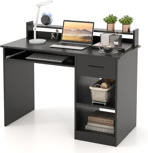 Área de trabajo expansiva: nuestro escritorio de oficina cuenta con una espaciosa mesa de 41.5 pulgadas de ancho x 22 pulgadas de profundidad, completa con un gabinete de almacenamiento para maximizar la eficiencia del espacio. Puede utilizar la parte superior para su monitor o computadora portátil, mientras coloca convenientemente el teclado en la bandeja de abajo para ahorrar espacio. Construcción robusta: fabricado con tableros gruesos de primera calidad, este escritorio ofrece una construcción robusta con una alta capacidad de carga para soportar tus elementos esenciales de trabajo. También hay almohadillas antideslizantes unidas para mayor estabilidad. Múltiples opciones de almacenamiento: organice sus suministros de trabajo con facilidad utilizando el cajón de almacenamiento y 2 estantes proporcionados por el escritorio de la computadora. El estante central ajustable de 5 posiciones se puede quitar para crear espacio para una torre de computadora. Montaje y mantenimiento sin esfuerzo: las instrucciones detalladas y las piezas claramente etiquetadas garantizan un montaje rápido de este escritorio de estudio. La superficie lisa e impermeable es fácil de limpiar, simplemente límpiala con un paño húmedo. Diseño moderno versátil: con un color puro y un aspecto elegante, esta mesa de PC complementa perfectamente varios estilos de decoración. El diseño práctico hace que sea un complemento ideal para tu oficina en casa, adecuado para el trabajo, estudio o incluso sesiones de maquillaje.