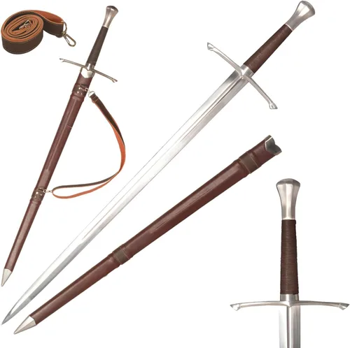 [Introducción] - Esta es una espada occidental medieval de dos manos, afilada como una espada completa. Material: la hoja está forjada a mano de acero de alto carbono 1095, la hoja afilada se debe utilizar con seguridad. Protector de mano y bola pesada: acero inoxidable 304. Mango: envuelto en madera con cuerda encerada. Vaina: madera envuelta en piel sintética ecológica. Espiga completa afilada: la hoja afilada es adecuada para el entrenamiento diario y corte: se puede utilizar en ramas, bambú, botellas de agua de plástico, latas, cartones, etc. Dimensiones: longitud total (con vaina) 46.5 pulgadas/46.5 in. Longitud total sin funda 44.3 pulgadas/44.3 in. Longitud de la hoja: 33.85 pulgadas. Longitud del mango: 10.43 pulgadas. Peso: 4.3 lbs / 4.3 libras. Escenario de uso: entrenamiento diario, corte al aire libre. Correa de hombro ajustable: se puede llevar en cualquier lugar. ️Puedes regalárselo a tu familia y amigos como un regalo especial, es especial. ️Hecho a mano, se puede utilizar como artículo de coleccionista. [Servicio posventa] - Si tienes alguna pregunta sobre la espada que recibiste, ponte en contacto con nosotros, te responderemos lo antes posible y te proporcionaremos un programa posventa exclusivo, ¡gracias! ️Nosotros, corazones, una fina espada forjada con cuidado.