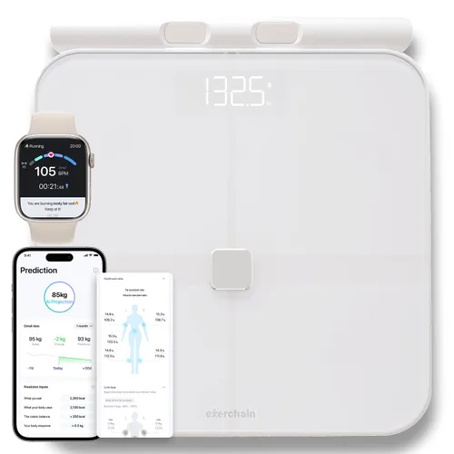 Pronóstico de salud impulsado por la IA: vea hacia dónde se dirige su salud, no solo hacia dónde está ahora. Obtenga predicciones personalizadas para sus tendencias de peso futuras basadas en sus insumos y hábitos diarios. Integración Smart Fitness: sincroniza con tu reloj inteligente o ExerRing para realizar un seguimiento de los entrenamientos automáticamente. Detecta la intensidad del entrenamiento en tiempo real y recibe comentarios guiados por IA para alcanzar tus objetivos de fitness más rápido. Guía de registro de comidas y calorías sin esfuerzo: Registre sus comidas en segundos con entrada basada en texto o fotográfica. La aplicación calcula las calorías restantes utilizando su tasa metabólica activa (AMR), lo que hace que el seguimiento de la dieta sea más simple que nunca. Análisis integral de la composición corporal: Mida más de 40 métricas de salud, incluido el IMC, % de grasa corporal, masa muscular, grasa visceral, edad metabólica y más, todo en un solo escaneo. Tecnología de alta precisión de 8 electrodos: Experimente resultados más precisos y estables con nuestros sensores de 8 electrodos. Realice un seguimiento incluso de pequeños cambios con precisión de grado profesional. Experiencia perfecta de aplicaciones y dispositivos: fácil de configurar, intuitivo de usar. La elegante pantalla LED y la interfaz inteligente de la aplicación te permiten monitorear el progreso en cualquier momento, ya sea que tu objetivo sea perder grasa, ganar músculo o simplemente mantenerte equilibrado.