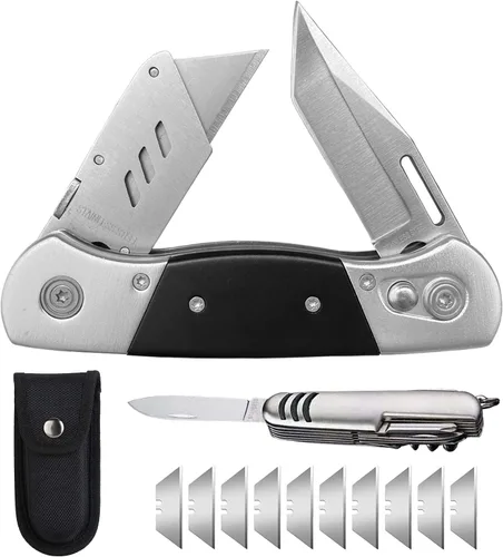 POWERFUL UTILITY KNIFE: Designed with cool dual blade, get more task done with our durable utility knife! A must-have multiPurpose tool for the family. SAFE&RELIABLE: Ergonomic curve handle fits your hands and provides more security and comfort grip for you. 3 screws securely hold the boxcutter blade, no need to worry about the blade slipping while working. QUICK-CHANGE MECHANISM: Easily release the blade for replacement. Compatible with most standard SK5 utility blades for extra convenience. (10 blades included) KNIFE SHEATH INCLUED: High quality nylon pouch for secure storage and quick access on belts. Slide into your sheath, it ready to work anytime. Our utility knife is your go-to tool for projects around your house, on the work, or outdoor. MULTI-FUNCTION TOOL: Ideal for cutting thick materials – As wallpaper, Corrugated cardboard, Carpets, Rope, Fabrics, Thin wood, Laminates, Leather, Plastics, Rebber, Scoring sheet rock, Carton. A multitool pocket knife is included, to help you complete tasks faster and more conveniently.