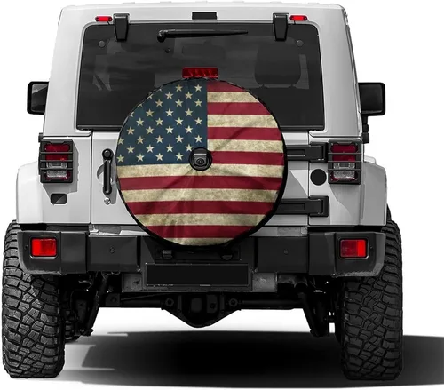 Foruidea Funda para neumático de repuesto con bandera estadounidense retro con orificio de cámara de respaldo, cubierta de neumático para remolque