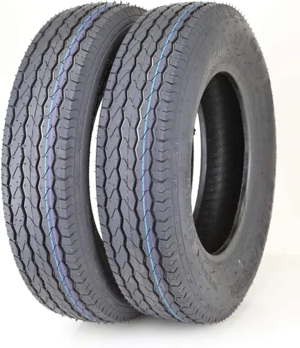 2 nuevos neumáticos de remolque ST175/80D13 Bias. Todos nuestros neumáticos son nuevos, de primera calidad y nunca han sido montados. Este neumático se ha vendido al por mayor en gran volumen a fabricantes de remolques y distribuidores de neumáticos en todo el país. ¡Compra y utiliza nuestros neumáticos con confianza! Especificaciones del neumático Tamaño del neumático: 175/80D13 Marca: Free Country Patrón: VR383 Clasificación de capas: 8 Rango de carga: D Diámetro total: 24" Ancho de sección: 6.8" Profundidad de la banda de rodadura: 0.29" Carga máxima - neumático individual: 1570 libras a 65 psi Anchura de la llanta: 5 pulg Peso: 15 libras