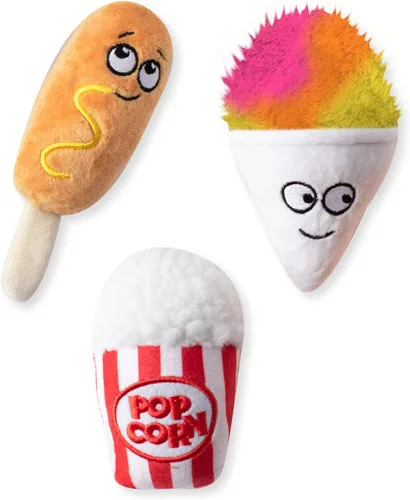 3 juguetes para 3 veces la diversión Chirriador fuerte en cada juguete Ideal para buscar y jugar Perfecto para perros de tamaño pequeño Cada juguete es aproximadamente: Perro de maíz: 5" h x 3" w cono de nieve: 5" h x 3" w palomitas de maíz: 5" h x 3" w