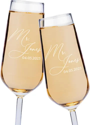 Brinda por un amor infinito en el día de tu boda: Levanta una copa y celebra tu amor con nuestras copas de champán personalizadas. Añade un toque de brillo y alegría burbujeante a tu día especial con este elegante y elegantemente elaborado juego de 2 copas de champán. ELEVA LA SOFISTICACIÓN DE TU BODA: Estas copas de champán bellamente elaboradas realzarán la elegancia de tu boda, aniversario, novia y novio, y fiesta nupcial. Son un recuerdo perfecto para tu día especial. Crea un recuerdo duradero: Personaliza tus flautas de champán añadiendo los nombres y fechas de la pareja para crear un recuerdo de boda único. DIMENSIONES: Nuestras flautas de champán son de 8 pulgadas (20 cm) de altura y tienen un diámetro inferior de 2 5/8 pulgadas (5.3 cm) y un diámetro superior de 2 pulgadas. Orgullosamente hecho a mano: en GiftByGifty, tenemos mucho cuidado en la elaboración de cada pedido, sabiendo que estamos remodelando tus historias como un regalo o recuerdo. Es un honor para nosotros combinar nuestra artesanía con sus historias, y ser parte de la sonrisa en sus rostros. Estas flautas de champán elegantemente personalizadas están orgullosamente hechas a mano por nuestro equipo en California, Estados Unidos.