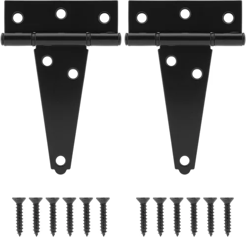 HILLMASTER Bisagra de correa de puerta duradera resistente que añade estabilidad y facilidad de funcionamiento. El paquete incluye: 2 bisagras con correa en T de 4 pulgadas 16 tornillos de 1 pulgada Característica: ➤ Diseño de agujero avellanado, superficie plana después de las instalaciones. ➤ Dura mucho tiempo sin mostrar desgaste ni óxido. ➤ Pin ajustado para aplicaciones con mano izquierda o derecha. ➤ Fácil de instalar para varios proyectos de bricolaje. ➤Experiencia silenciosa y suave. Especificaciones: Color: negro Material: Hierro de acero Grosor: 0.079 in Tamaño total: 4"x3-1/8"x1-1/4" Diámetro del agujero: 0.727" Capacidad de carga: 45 lbs Ángulo de rotación: 0-270 Estos herrajes para puertas están diseñados para mayor resistencia y longevidad y mejorarán tu diseño de seguridad de puerta o valla de madera.