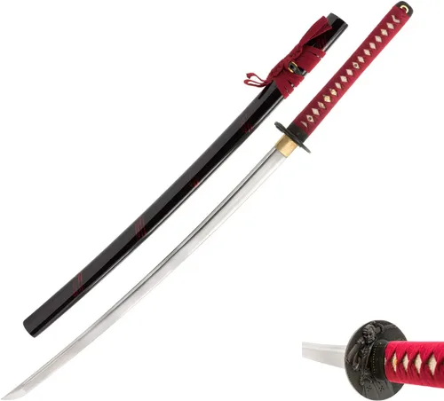 PRODUCTO 145 Modelo: Afilado wakizashi Tsuba: Guerrero Tsuba Acero: acero al carbono 1045 Hoja: Totalmente forjado a mano templado calor, hi (ranura de sangre) Borde: Afilado a mano por piedra de afilar japonesa Hamon (línea templada): Sí Tsuka (mango): Mango de madera cubierto en piel de rayos genuina y envuelto en algodón tradicional japonés ito con menuki de dragón Tang: Espiga completa con 2 clavijas de madera (mekugi); grabado con la firma del herrero Saya(Vaina): Madera lacada piano negro con sageo de algodón rojo (cuerda) La espada se puede desmontar y volver a montar por completo. Longitud de la hoja (con Habaki): 21" Longitud del mango: 9.5" Longitud Total (con Saya): 32" Peso con Saya : 2.4 lb Peso sin Saya: 1.8 lb Peso del paquete: 4 lbs El paquete incluye: 1 wakizashi ensamblado con saya 1 bolsa wakizashi de algodón negro. 1 caja de cartón Wakizashi de tubo