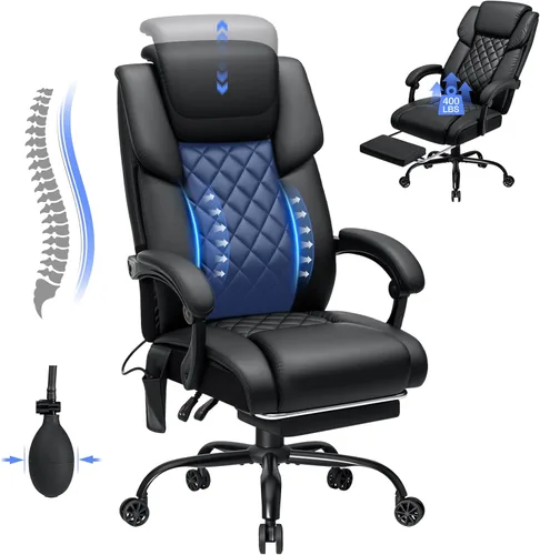 Ajuste lumbar: esta silla de oficina ejecutiva cuenta con soporte lumbar ajustable, contorneado con precisión para adaptarse a diferentes tipos de cuerpo. El respaldo curvado en S incorpora un cojín lumbar inflable, simplemente presiona la bolsa de aire para personalizar el soporte de la parte inferior de la espalda. Ya sea trabajando o descansando, mantiene tu columna vertebral en una alineación naturalmente relajada Reposacabezas de altura ajustable: esta silla de oficina ergonómica cuenta con un reposacabezas de 5 posiciones con 4.72 pulgadas de ajuste vertical, lo que permite una personalización precisa para usuarios de todas las alturas y tipos de cuerpo. El diseño ergonómico contorneado refleja perfectamente la curvatura natural de tu cuello, ofreciendo un apoyo específico a la columna cervical que alivia eficazmente la tensión del cuello durante sesiones de trabajo prolongadas Piel sintética y cojín grueso: el asiento está tapizado con espuma resistente de alta densidad y resortes independientes en bolsillo, ofreciendo comodidad de felpa pero de apoyo que distribuye eficazmente la presión de la cadera mientras mantiene la integridad estructural durante una sesión prolongada. Con piel sintética perforada resistente al desgaste e impermeable, la superficie garantiza una transpirabilidad óptima, limpieza sin esfuerzo y durabilidad duradera, transformando el mantenimiento diario en una experiencia sin complicaciones Diseño reclinable: el respaldo se reclina de 90° a 135° y viene con un reposapiés retráctil oculto, que se transforma fácilmente en una cómoda tumbona para la siesta. La altura del asiento es libremente ajustable para adaptarse a varias configuraciones de escritorio, lo que permite transiciones suaves entre el trabajo enfocado y los modos relajados Silla de escritorio resistente: la silla de oficina grande y alta ha pasado una prueba de carga de 400 libras y está construida con un marco de metal resistente y un elevador de gas a prueba de explosiones clase 3 certificado SGS, asegurando un ajuste de altura suave y seguro. Las ruedas silenciosas de 360° se deslizan suavemente en varios tipos de suelo sin rayar, manteniendo tu espacio de trabajo silencioso y sin marcas Fácil de montar: nuestra silla de oficina resistente viene con un manual impreso y un video de instalación en línea. El montaje es sencillo y tarda solo 20 a 30 minutos