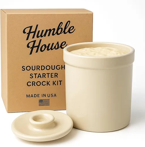 Humble House Kit de inicio de pan de masa madre de 1/2 galón Sauerkrock Open Ceramic Crock con tapa, 2 litros de gran capacidad, tarro de 64 onzas