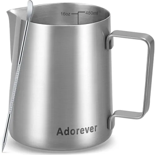 Accesorios perfectos para expreso: la jarra de espuma de leche Adorever es muy práctica para muchos usos en la cocina: espumar o cocinar leche al vapor para lattes, medir líquidos, servir leche o crema, sumergir, etc. Jarra espumadora perfecta para espresso, capuchino o chocolate caliente.