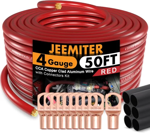 Cable de tierra de potencia CCA rojo de 4 calibres de 50 pies: nuestro cable primario CCA es la opción más económica para elegir cable de alimentación o tierra y es un gran conductor de potencia. El aluminio recubierto de cobre le da un cable de alimentación económico con una excelente transferencia de energía. Los sistemas que requieren más energía deben usar cableado de cable ofc. Juego de cables de alimentación/tierra: nuestro juego de cables de alimentación es ideal para un amplificador o subwoofer de automóvil o para ser utilizado como cable de tierra en tu cable eléctrico instala. Uso para muchas aplicaciones diferentes, como iluminación interior, radio de automóvil, automóvil, iluminación, altavoces de automóvil, cables de alimentación, inversor de corriente de 12 V, cable de tierra o cable de soldadura. Con lengüetas de batería y tubo termorretráctil Chaqueta suave al tacto: diseño de chaqueta suave al tacto diseñado para el instalador de reparación eléctrica y de automóviles en mente. Chaqueta de PVC resistente pero duradera que es mejor para uso en interiores, pero tiene flexibilidad, elasticidad y resistencia al impacto incorporada. Amplia compatibilidad: también conocido como cable de alimentación, cable de tierra, cable de motor de arrastre, cable automotriz, cable de altavoz, cable de radio de automóvil, cable de amplificador, cable eléctrico o cable de soldadura diseñado para voltaje de hasta 300 V. El paquete incluye: alambre de calibre 4 de aluminio recubierto de cobre de 50 pies, 10 lengüetas AWG8-3/8 (SC10-10) y 10 tubos termorretráctiles.