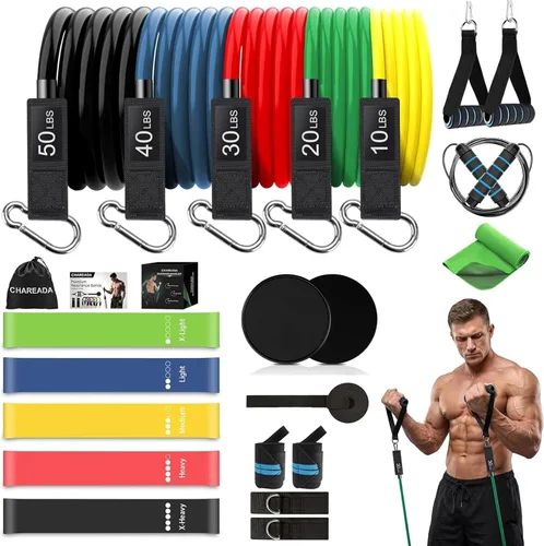Múltiples opciones de entrenamiento: las bandas de resistencia están hechas de látex natural de la más alta calidad y ecológico, material ABS y EVA de alta calidad, que vienen con asas resistentes y anclaje como un conjunto completo. Muchas herramientas de ejercicio de la más alta calidad satisfacen completamente todas tus demandas y encuentran una forma de ejercicio que se adapte mejor a ti, lo que también garantiza una experiencia de fitness saludable. Compra con confianza Bandas de resistencia de tubo mejoradas: Las bandas de resistencia de tubo de 48 pulgadas vienen con 5 niveles de resistencia diferentes, que se pueden usar solas o apiladas en cualquier combinación para un máximo. 150 libras – Amarillo 10 libras, verde 20 libras, rojo 30 libras, azul 40 libras, negro 50 libras. Cada banda de tubo tiene doble capa y está cuidadosamente construida para proporcionar mayor durabilidad y máxima resistencia. Ideal para tonificar tus cuádriceps, glúteos, nalgas, abdominales, bíceps, tríceps, piernas y rodillas. Bandas de resistencia de bucle resistentes: Las bandas están hechas de 100% látex natural y libres de TPE y vienen en 5 niveles de resistencia: Verde X-Light, Azul Light, Amarillo Medium, Rojo Heavy, Negro X-Heavy. Ideal para mejorar la fuerza y la movilidad – 【se puede usar para integrarse sin problemas con cada programa de entrenamiento popular, incluyendo yoga, pilates】 – 【Perfectas para sentadillas, fortalecer los músculos de las piernas, flexiones de rodilla, flexiones laterales.】 Deslizadores de doble cara: 2 deslizadores de núcleo de fitness funcionan sin problemas en todas las superficies para que no importe la superficie que tengas. Doble cara, un lado es de tela y el otro lado es liso, lo que asegura que deslices fácilmente y mantengas tus pies en su lugar. Los discos son un entrenamiento total del cuerpo que es de muy bajo impacto pero altamente eficaz para construir la fuerza del tronco, te da un intenso entrenamiento abdominal y para todo el cuerpo. Juego de bandas de resistencia todo en uno: Este juego de bandas de resistencia incluye 5 bandas de tubo de resistencia codificadas por colores, 5 bandas de resistencia de bucle resistentes, 2 deslizadores de núcleo de doble cara, 2 asas, 2 correas de tobillo, 1 anclaje de puerta, 1 toalla de enfriamiento instantáneo, 2 muñequeras, 2 bolsas de transporte. Todos ellos están bien probados para garantizar un estándar calificado.