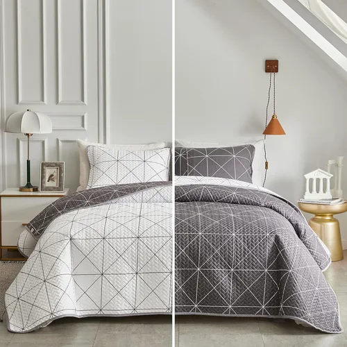 Juego de edredón reversible de 2 piezas, cuadriculado blanco y gris, tamaño individual 68 x 86 pulgadas, suave microfibra ligera, colcha de verano