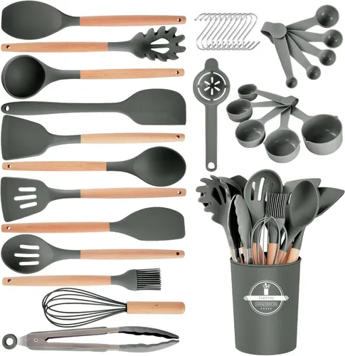 【Rendimiento confiable de silicona de grado alimenticio】 Los componentes de silicona duradera mantienen la flexibilidad después de un uso repetido, resistiendo mejor la deformación que las alternativas de plástico. Resistente al calor hasta 446 °F/230 °C, adecuado para varias técnicas de cocina desde saltear hasta hornear. Antes de usar los utensilios de cocina de silicona por primera vez, el olor original desaparecerá después de lavar los utensilios de cocina en agua y exponerlos al aire durante aproximadamente 3 horas. 【Mangos de madera cómodos】 Los mangos de madera naturales proporcionan un agarre ergonómico y antideslizante que se mantiene cómodamente fresco durante la cocción. A diferencia de los mangos de metal que conducen el calor, la madera aísla naturalmente, lo que hace que estas herramientas sean cómodas para sesiones de cocción prolongadas. El aspecto clásico de madera añade encanto rústico a cualquier cocina. 💡Si estás buscando utensilios de cocina más grandes, te recomendamos el juego de 7 piezas. 【Juego completo de cocina de 34 piezas con mango de madera】Incluye espátula con ranuras*1, espátula sólida*1, separador de huevos*1, batidor*1, pinzas*1, espátula redonda*1, cuchara para espaguetis*1, cucharón*1, espátula*1, espátula*1, cucharas medidoras*5, tazas medidoras*5, pincel de repostería*1, cuchara con ranuras*1, cuchara sólida*1, 10 ganchos y un soporte para una cocina versátil. Diseño amigable con el revestimiento: la construcción de silicona flexible garantiza una interacción segura con todas las superficies antiadherentes. A diferencia de los materiales rígidos que pueden rayar los revestimientos, estos utensilios se adaptan a los contornos de la sartén sin fricción abrasiva. La superficie lisa se desliza sin esfuerzo mientras cocina, eliminando el riesgo de desgaste prematuro en las capas protectoras de sus utensilios de cocina. Su naturaleza no porosa evita que los olores y manchas de los alimentos persistan, mientras que la textura suave facilita la limpieza después de preparar ingredientes pegajosos como masa o batido. 【Elección de regalo y servicio posventa】El juego de utensilios de cocina de silicona es una excelente opción de regalo para inauguraciones de casa, listas de regalo de bodas o celebraciones de Año Nuevo. No recomendamos remojar en agua durante mucho tiempo o lavar en lavavajillas. Si tienes alguna pregunta durante la compra o uso, estaremos encantados de ayudarte. Ponte en contacto con nosotros, te responderemos rápidamente dentro de las 12 horas.