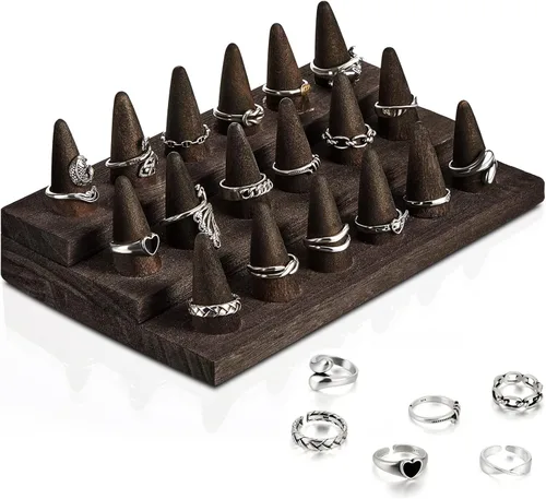 Contenido del paquete: recibirás 1 pieza de almacenamiento de anillo en un paquete, con 18 soportes para dedos, cantidad suficiente para satisfacer tus necesidades de uso diario y reemplazo, puedes compartirlo con tus amigos al mismo tiempo Detalles de las dimensiones: el soporte de anillo es de 7.87 x 4.72 x 1.57 pulgadas, y el dedo meñique es de 0.79 x 1.57 pulgadas, que es del tamaño adecuado, adecuado para colocar en la mayoría de lugares, no ocupa mucho espacio Material resistente y sólido: el soporte de exhibición de anillos está hecho principalmente de material de madera, que es resistente y sólido, no se decolora ni rompe fácilmente, con una superficie lisa, por lo que no tienes que preocuparte por rayar tus manos, material confiable que se puede aplicar durante mucho tiempo Accesorio práctico y útil: nuestras exhibiciones de anillos tienen un total de tres estantes de exhibición, cada juego de capas con 8 dedos pequeños se puede aplicar para almacenar y mostrar tus anillos, no solo puede desempeñar un buen papel en el almacenamiento de escritorio, sino también como un artículo decorativo para hacer que tu mesa ya no sea monótona Suministro para varias ocasiones: el soporte para anillos tiene una amplia gama de usos, no solo se puede colocar en casa para hacer que tu cómoda esté ordenada y ordenada, sino que también se puede colocar en otros lugares para mostrar anillos, como tiendas minoristas, ferias comerciales o ferias de manualidades, aportando comodidad a tu vida