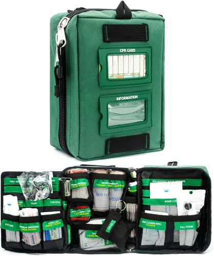 BearHoHo Práctico kit de primeros auxilios de 3 capas bolsa médica kit de emergencia para camping, senderismo, lugar de trabajo, coche, caravana, viajes, hogar, oficina Características 1. INTELIGENTE: Este kit educa al usuario y reduce los niveles de estrés durante emergencias. Cada componente está etiquetado, diciéndole cuál es el artículo, para qué debe usarse 2. Duradero, fuerte y diseñado para durar. Hecho de poliéster 600D, este kit de primeros auxilios viene en la bolsa más fuerte de su clase de precio. 3. Ligero y portátil. Mide 8.7 x 6.7 x 3.6 pulgadas y puede caber en la caja de tu automóvil. Las correas compatibles en la parte posterior permiten al usuario llevarlo en otras bolsas o en tu cinturón. Llévala contigo en viajes por carretera, senderismo, mochileros, camping, viajes o mantén tu propia seguridad en casa, escuela o en el lugar de trabajo. Bolsa resistente al agua y bolsas laminadas interiores a prueba de agua que protegen todos los artículos contra la humedad. Lista de embalaje 1 bolsa verde. 1 veneno para tirar. 60 apósitos adhesivos. 2 vendajes triangulares (37.8 x 37.8 x 53.5 in). 1 folleto de primeros auxilios. 2 vendajes de presión (3.9 x 177.2 in). 1 cinta hipoalergénica (1.0 x 70.9 in). 1 tira de escaneo de fiebre. 1 bloc de notas. 1 bolígrafo. 1 pinza (4.7 in). 1 tijeras (5.7 in). 2 almohadillas para los ojos. 4 toallitas de limpieza para la piel (1 en RCP) 4 apósitos para heridas no adherentes (3.0 x 3.0 in, grande). 5 apósitos para heridas no adherentes (2.0 x 2.0 in, pequeño). 1 manta de emergencia (63.0 x 82.7 in). 4 x gel de quemadura (0.12 oz/pieza). 3 guantes (3 pares, 1 par en RCP) 10 bolsas de plástico (tamaño mixto) 10 pasadores de seguridad. 8 hisopos de gasa de algodón (3.0*3.0 in, grande). 5 hisopos de gasa de algodón (2.0*2.0 in, pequeños) 1 cierre de heridas. 5 sondas de astilla. 25 barras de algodón de yodo 1 vendaje para heridas
