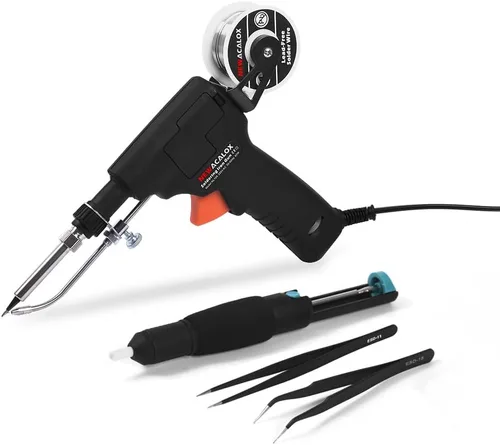 Calentamiento rápido y temperatura ajustable: el soldador NEWACALOX de 80 W se calienta rápidamente a la temperatura deseada en solo 10 segundos, gracias al núcleo de calefacción de cerámica avanzado. Perilla de control de temperatura ajustable más grande para obtener una temperatura precisa de 356 °F a 968 °F para una variedad de tareas de soldadura Soldadura con una sola mano: más fácil de soldar: no necesitas apuntar tu alambre de estaño y pistola de estaño con todas tus manos nuevamente y ya no te quemarás las manos accidentalmente debido a la función de alimentación automática de estaño. Vale la pena trabajar en lugares pequeños Kit completo 5 en 1: 1 pistola de soldadura, 2 pinzas, 1 bomba desoldadora, 1 cable de soldadura de 0.039 in* 1.76 oz. Adecuado para placas de circuito de soldadura, reparación de electrodomésticos, aficionados al bricolaje, reparación de automóviles y soldadura de joyas Amplia aplicación: perfecto para soldar placas de circuito, reparaciones de electrodomésticos, proyectos de bricolaje, fabricación de joyas, reparación de cables automotrices, cableado de motocicleta, guitarra reparada, restauración de automóviles y electrónica. Ideal para principiantes, aficionados y profesionales por igual Portátil y conveniente: a diferencia de las estaciones de soldadura voluminosas, el tamaño compacto de la pistola y el diseño ligero se adapta cómodamente a mi mano y es fácil de transportar, lo que es conveniente cuando estoy trabajando en proyectos en diferentes lugares. Simplemente conecta y usa 【Más adecuado para soldadura precisa】: fácil de arreglar el atasco con el panel lateral extraíble+ se puede doblar en el tubo de alimentación de soldadura, lo que lo hace mucho mejor que el procedimiento de soldadura tradicional que requería ambas manos, perfecto para lugares más difíciles de alcanzar y para soldar terminales de conector