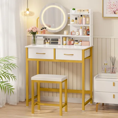Espacio de belleza organizado: este tocador de 31.5 x 17.7 x 50.6 pulgadas cuenta con estantes abiertos y dos cajones diseñados para almacenar maquillaje, cuidado de la piel y herramientas de belleza en secciones claramente separadas. Una amplia mesa proporciona un amplio espacio para una aplicación cómoda de maquillaje. Disfruta de una estación de belleza ordenada que admite rutinas diarias suaves y enfocadas. Espejo LED de 3 modos: este tocador está equipado con un espejo LED redondo con controles táctiles para una fácil operación. Los modos de iluminación ajustable fría, natural y cálida soportan diferentes condiciones de iluminación. Disfruta de una visibilidad constante y una aplicación de maquillaje precisa incluso en espacios con poca luz con el espejo de tocador con luz Taburete a juego incluido: Este tocador con luz se combina con un taburete a juego que ofrece comodidad acolchada y altura adecuada del asiento. El diseño integrado garantiza una configuración cohesiva sin muebles que no coincidan. Es fácil obtener una estación de tocador lista para usar sin la molestia de compras adicionales. Equilibrado y seguro: este tocador está construido con un marco de metal reforzado e incluye un anclaje de pared anti-punta para mayor seguridad. El anclaje asegura el tocador firmemente a la pared, reduciendo el riesgo de inclinación. Los pies niveladores mantienen el escritorio estable en superficies irregulares, lo que te permite sentirte libre de tambaleo durante el uso diario. Cajones de tela plegables: este tocador de maquillaje incluye cajones de tela plegables que se instalan fácilmente sin pasos complicados. La sencilla configuración del cajón mantiene el almacenamiento práctico mientras mantiene un diseño visual limpio. Es un tocador limpio y moderno que se ve elegante mientras mantiene los elementos esenciales de maquillaje diarios organizados.