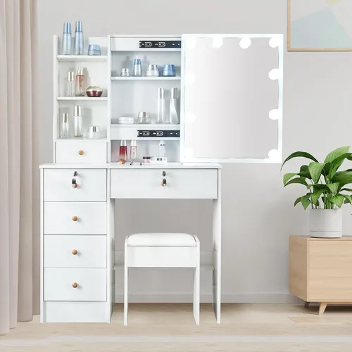 • Espejo iluminado deslizante: espejo de gran tamaño de 23.6 pies de alto x 19.7 pies de ancho que guía el maquillaje en toda la parte superior del cuerpo (incluyendo la ropa). El maquillaje colocado en el estante detrás del espejo se conservará mejor cuando el espejo se deslice hacia el centro Ilumina tu belleza: 10 bombillas LED y 3 modos de brillo para las necesidades diarias como maquillaje, producción de video, iluminación y mucho más Cajones de cierre suave: tres cajones de tamaño para encontrar el espacio adecuado para todo, desde esmalte de uñas/lápiz labial hasta rizador/secadora. (El cajón con cerradura puede salvar tus cosméticos de los niños) 【Dimensiones】Cómoda (excluyendo la parte superior de la mesa): 27.5 pies de alto x 31.5 pulgadas de ancho x 15.7 pulgadas de profundidad, espejo: 23.6 pies de alto x 19.7 pulgadas de ancho, taburete: 12.6 pies de alto x 14.2 pulgadas de ancho x 8.7 pulgadas de profundidad 【Montaje】Necesita un montaje completo. Todas las piezas están marcadas por números numéricos y se pueden montar en 40 minutos por dos adultos de acuerdo con las instrucciones (idioma español no garantizado)