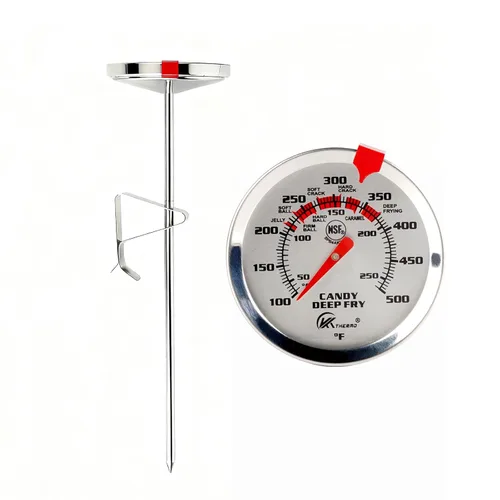 Doble uso para dulces y freír: diseñado con zonas de temperatura claras (gelatina, bola suave, grieta dura, caramelo, freír), este termómetro garantiza la precisión ya sea para hacer jarabe o freír alimentos. Amplio rango de temperatura: mide de 100 °F a 500 °F (104.0 °F a 500.0 °F), cubriendo la fabricación de dulces, frituras profundas y otras necesidades de cocción. Sonda de acero inoxidable con clip para olla: la sonda duradera de 8 pulgadas de largo se mantiene estable en la olla con un clip ajustable, dejando tus manos libres para una cocción segura. Esfera grande de 2.5 pulgadas e indicador ajustable: cara fácil de leer con puntero rojo y marcador rojo móvil que te permite ajustar y rastrear tu temperatura objetivo de un vistazo. Certificado NSF y fácil de limpiar: calidad de grado profesional; limpiar después de su uso (no apto para lavavajillas). Ideal para cocinas domésticas, panaderías y freidoras.