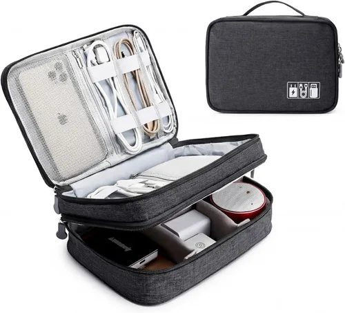 Doble capa y bien organizado: este organizador de artículos electrónicos de viaje está diseñado con múltiples bolsillos y varios tamaños de bandas elásticas que proporcionan una gran flexibilidad para organizar accesorios electrónicos como cable USB, unidad flash, cargador de pared, tarjeta SD, disco duro, banco de energía, auriculares, cámara. Un gran bolsillo de malla con cremallera. 【Hazlo tú mismo y gran capacidad】 - Los estuches de almacenamiento de aparatos tienen 3 divisores acolchados extraíbles, para que puedas diseñar la disposición como desees para mantener todos tus accesorios electrónicos de viaje en perfecto orden. 【Compacta y portátil】: Dimensiones de la bolsa de almacenamiento de electrónicos: 9 x 6.3 x 3.5 pulgadas (23*16*9 cm), este organizador de cables será un ayudante perfecto mientras estés de viaje o en viajes de negocios. Su tamaño perfecto permite que se pueda poner fácilmente en tu mochila y equipaje. Y también es muy adecuado para uso familiar y organización diaria. Material de alta calidad: la bolsa organizadora de viaje con cable está hecha de tela duradera e impermeable. Interior semiflexible bien acolchado, excelente protección para tus dispositivos contra arañazos, polvo, impactos y caídas accidentales. 【VIAJES MÁS FÁCILES】 - Diseñado con un asa robusta para llevar todo lo que necesitas fácilmente. Las cremalleras suaves hacen que sea más fácil abrir y cerrar la bolsa para obtener tu cargador, cable o cualquier otro accesorio electrónico en poco tiempo. Si estás cansado de hurgar por la casa en busca de tus pequeños dispositivos, este organizador tecnológico puede hacerte un favor.