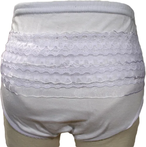Pañal de punto de polialgodón adornado con filas de encaje. Talla única para 3 a 12 meses.