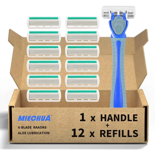 Miechua maquinillas de afeitar para hombres Incluye un mango de 6 cuchillas y 12 cartuchos de repuesto. El cabezal pivotante mantiene constantemente un contacto cercano con los diversos contornos de tu piel, para un afeitado cómodo y cómodo. El mango ergonómico con agarre de goma se adapta a tu mano como un guante y evita que la maquinilla de afeitar se deslice. La vitamina E y el aloe vera en la tira de lubricación calman y cuidan tu piel. Para cargar y rellenar el portacuchillas, presione y mantenga presionado el botón en el mango y empuje el portacuchillas hacia el portacuchillas cuando esté en el distribuidor. El deflector en el centro del mango se puede colocar en dos posiciones diferentes, que se pueden ajustar según sea necesario. Después de su uso, se puede lavar directamente con agua y luego secar. También se puede utilizar en la ducha sin preocuparse por dañar la maquinilla de afeitar. Es mejor usarlo junto con espuma de afeitar o crema de afeitar, el efecto será mejor.