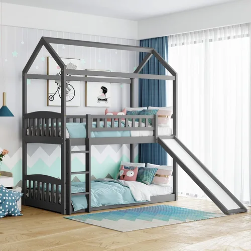 Fabricada con un diseño caprichoso de casa de juegos, esta litera viene con tobogán y escalera. Construido a partir de madera de pino maciza seleccionada y pernos de MDF y aleación de hierro que mantienen toda la cama resistente y libre de tambaleo. Cuenta con rieles de protección en la litera superior para mayor seguridad y durabilidad. No requiere somier. Grosor del colchón de 4-6 pulgadas recomendado para la cama superior y 8 pulgadas para la cama inferior. Dimensiones: 77.4 pulgadas de largo x 42.5 pulgadas de ancho x 84.4 pulgadas de alto; la cama superior soporta hasta 250 libras, la cama inferior soporta hasta 300 libras.