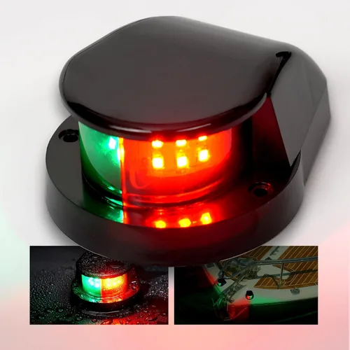 Especificación: Voltaje - DC 12V; Potencia – 6W; 12 LED (6 rojos + 6 verdes); Ángulo de radiación - 225 grados; Resistente al agua IP67: Mantiene la luz durante la lluvia o vientos fuertes durante el viaje, evita daños por cortocircuitos debido a la humedad; Bicolor y visible, rojo para el lado de babor y verde para el lado de estribor, puede usarse como luz de proa y luz de popa. Los LED brillantes proporcionan una iluminación de seguridad de barco simple y efectiva con bajo consumo de energía. Cumple con los requisitos de USCG para visibilidad de 2 millas náuticas; Material duradero: Hecho de carcasa de plástico ABS de ingeniería de alta calidad, construcción ligera y vida útil prolongada; Fácil de instalar: montaje con un destornillador, tornillos incluidos en el paquete.