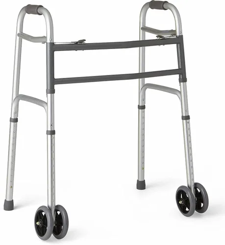 El andador plegable bariátrico de alta resistencia Medline con ruedas de 5 pulgadas y asas duraderas es un andador resistente y confiable que es perfecto para personas que necesitan apoyo adicional. El andador pesa 11 libras. y tiene una capacidad de peso de 500 libras, por lo que es ideal para personas de tamaño grande. La altura se puede ajustar fácilmente de 33.5 a 43.5 pulgadas. El andador plegable también cuenta con ruedas de 5 pulgadas que proporcionan un paseo suave y cómodo. Las asas duraderas proporcionan un agarre cómodo, y es fácil de plegar y desplegar para portabilidad.