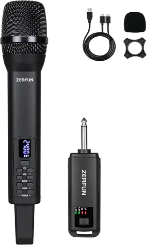 ¡Aquí están los micrófonos inalámbricos recargables ZERFUN! Están equipados con controles independientes para volumen, eco, agudos y graves. Son la elección perfecta para karaoke en casa, reuniones, fiestas, iglesias, eventos de DJ, bodas y muchas más aplicaciones! Este micrófono inalámbrico cardioide bien hecho tiene la capacidad de captar ruido de manera unidireccional (solo habrá sonido cuando hablemos hacia la parte superior del micrófono, mientras que no habrá sonido al hablar a los lados). Con este patrón de captación, las voces direccionales se pueden separar sin esfuerzo del ruido de fondo. Para la salida, la salida del receptor de 6.35 mm (1/4 pulgada) está diseñada específicamente para altavoces, sistemas de altavoces PA, amplificadores de potencia u otros dispositivos con entrada MIC (Tenga en cuenta: este conjunto de micrófonos no es adecuado para teléfonos, PC o cámaras). Para información sobre la batería, tanto el micrófono como el receptor tienen baterías recargables integradas. Cuando está completamente cargado, el tiempo de funcionamiento del micrófono es de aproximadamente 8-10 horas, y el tiempo de funcionamiento del receptor es de aproximadamente 4-5 horas. Para el alcance de transmisión, el micrófono inalámbrico ZERFUN tiene un rango alcanzable de hasta 164 pies (al aire libre), y su rango de frecuencia de 2.4GHz cumple con las regulaciones de la FCC. LISTA DE CONTENIDO: 1 micrófono recargable inalámbrico ZERFUN; 1 receptor; 1 cable de carga; 1 protector de micrófono; 1 anillo antideslizante; 1 manual de usuario.