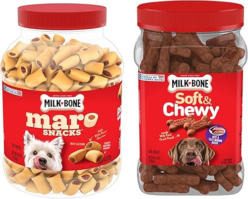 Contiene (1) recipiente de 40 onzas de golosinas para perros Milk-Bone MaroSnacks y (1) recipiente de 25 onzas de Milk-Bone Soft & Chewy Beef & Filet Mignon Recipe Treats MaroSnacks: La cáscara de galleta para perros encierra un verdadero centro de médula ósea. Crujientes por fuera y carnosos por dentro, nuestros bocadillos para perros MaroSnacks son una combinación satisfactoria de textura y sabor delicioso. MaroSnacks: Delicias saladas con calcio, con colores de ingredientes naturales solamente. Suave y masticable: estas golosinas suaves y masticables para perros están hechas con asado de mandril real y están fortificadas con 12 vitaminas y minerales. Ambas golosinas son perfectas para perros de todos los tamaños. Horneado con amor en los Estados Unidos.