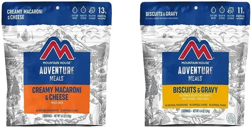 Mountain House Macarrones y queso cremosos | Alimentos liofilizados para mochileros y campamentos | 2 porciones Hacemos nuestros macarrones con queso para adultos. Hecho con fideos grandes y abundantes de macarrones, rica salsa de queso y cero conservantes o sabores artificiales, nuestros macarrones con queso satisfarán a toda la familia. Si está buscando agregar macarrones con queso a su plan de almacenamiento de alimentos a largo plazo o de emergencia, este es el que debe obtener. Esta comida Mountain House está respaldada por una garantía de sabor de 30 años, la vida útil más larga del mercado. Las comidas Mountain House se liofilizan para conservar los nutrientes y el sabor, lo que también hace que nuestras comidas sean ligeras. Perfecto para viajes, camping y mochilero. Sacamos el agua, simplemente la ponemos de nuevo. Mountain House Biscuits & Gravy | Alimentos liofilizados para mochileros y campamentos | 2 porciones Ahora puedes tener este clásico alimento reconfortante a cualquier lugar que te lleve tu aventura. Hecho con trozos de galletas de suero de leche reales y migas de empanada de cerdo en una salsa perfectamente salpicada. Sin conservantes, sabores ni colores artificiales. Este desayuno es la manera perfecta de alimentar al comienzo de un día lleno de aventuras. Empaquetado en una bolsa más corta y ancha similar a un tazón para una experiencia de alimentación más fácil, evita el servicio de platos y come directamente de la bolsa. Las comidas Mountain House se liofilizan para conservar los nutrientes y el sabor, lo que también hace que nuestras comidas sean ligeras. Perfecto para viajes, camping y mochilero. Sacamos el agua, simplemente la ponemos de nuevo.