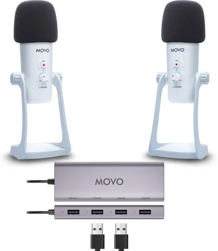 Movo Paquete de equipo de podcast USB para 2 – Interfaz USB con 2 micrófonos de condensador UM700 – Hub alimentado por 4 puertos para transmisión,
