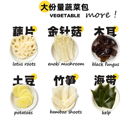 ¡15 minutos hecho! Solo necesitas una botella de agua, no necesitas fuego ni electricidad Fácil de transportar: adecuado para camping, picnic, fiesta o en cualquier lugar que no se pueda cocinar. Especias secretas: base de sopa tradicional china caliente, verduras frescas envasadas al vacío Variedad de sabores Vegetales picantes / no picantes Garantía Producto solo impreso con fecha de producción, cada sabor tiene vida útil. Nunca vendemos productos caducados