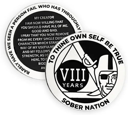 Diseñado en los Estados Unidos, este chip de sobriedad es un fantástico regalo de recuperación para cualquier persona que celebre un aniversario en Alcohólicos Anónimos o Narcóticos Anónimos. Está diseñado para ser un token memorable, que va más allá de los chips de recuperación ordinarios. Cuenta con un diseño único de Raider Pirate con un llamativo esquema de color plateado y negro, añadiendo un toque distintivo al medallón. 💪 Más grande y pesado que los chips AA típicos, este medallón mide 1.575 in de tamaño, 0.118 in de grosor y pesa 1.06 oz, realmente un chip de sobriedad de metal pesado. La oración del séptimo paso está elegantemente grabada en la parte trasera, junto con "To Thine Own Self Be True" y la primera línea de "How It Works" del Gran Libro de Alcohólicos Anónimos. Viene encerrado en su propio soporte para cápsulas de monedas, asegurando que llegue protegido y en excelentes condiciones, no más chips aburridos en bolsas pequeñas.